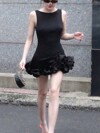 女士休闲性感 Y2K 纯色 V 领短袖荷叶边美人鱼下摆短款红色紧身连衣裙 - 派对装、优雅夏装、别致紧身风格