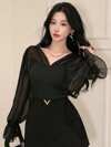 DAZY 女士 V 领拼布泡泡袖衬衫、长袖上衣、荷叶边透视装、秋装