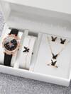 6 件/套女士简约蝴蝶与数字表盘石英腕表 + 蝴蝶首饰套装,不含表盒
