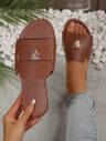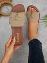 卡其色露趾平底凉鞋,带金属流苏扣装饰,露趾一脚蹬沙滩鞋,优雅休闲百搭夏季新款女士平底凉鞋
