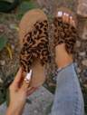 女士蝴蝶结装饰平底拖鞋,绒面圆头渔夫风格豹纹沙滩凉鞋,平底休闲夏季人字拖