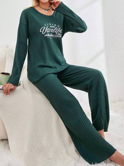 RueChic 女士字母印花條紋長袖及長褲家居服套裝 - 黑色 - 查看 1
