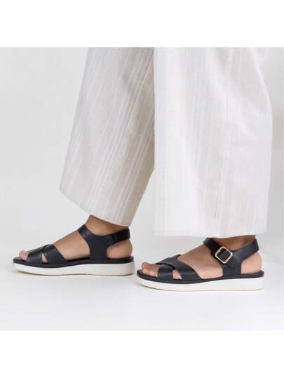 Women's Black Vegan Leather Outdoor Flat Sandals - 黑色 - 查看 1