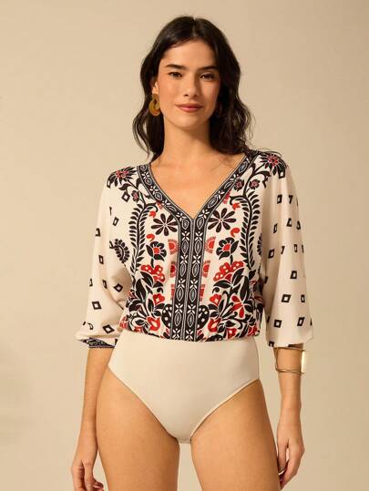 CAJUNI 女式波西米亚风热带植物与杜鹃花印花 V 领露背杏色休闲沙滩紧身衣,夏季 - 彩色 - 查看 1