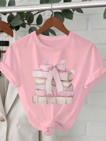 女士书本印花圆领短袖休闲百搭常规 T 恤 - 淺粉色 - 查看 1