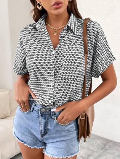 SHEIN Frenchy 女士休闲前扣短袖上衣,简约日常穿着 - 淺灰色 - 查看 1