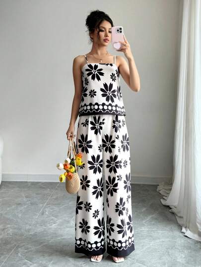 Breezaya 女士休闲度假黑白印花吊带背心和宽松裤子套装,夏季 - 黑與白 - 查看 1