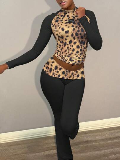 LovelyWholesale 女士休闲豹纹圆领长袖两件套,包括T恤和腰部翻领拼接长裤,适合秋季穿着。 - 黑色 - 查看 1