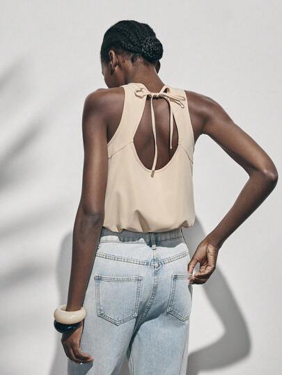 Lumivelle 女士圆领无袖露背修身短款上衣,纯色 - 杏色 - 查看 4