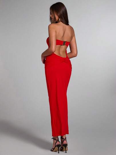 SHEIN BAE 女士优雅性感新年红色露肩金属装饰长款派对礼服,女士红色礼服,新年女装,新年女士礼服,适合派对穿着 - 紅色 - 查看 4