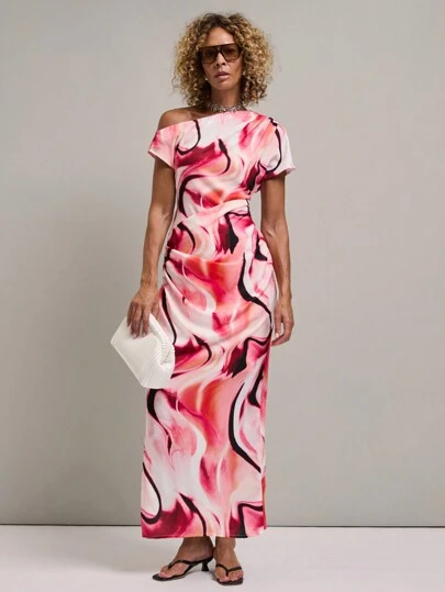 SHEIN Unity 女士时尚扎染不对称领连衣裙,夏季 - 彩色 - 查看 1