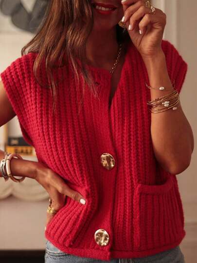 Astylish 女士火红色纯色纹理针织侧袋纽扣针织毛衣背心新年上衣节日服装 - 紅色 - 查看 1