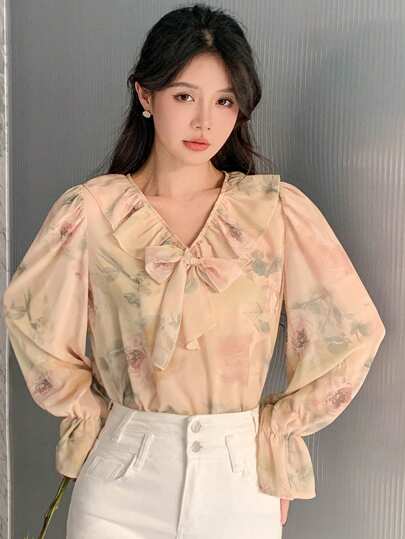 DAZY 女式花卉印花十字交叉系带喇叭袖衬衫,荷叶边长袖上衣 - 彩色 - 查看 1