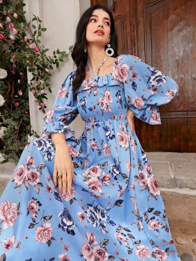 Seusyu 女款花卉印花荷葉袖連身裙 - 藍色 - 查看 1