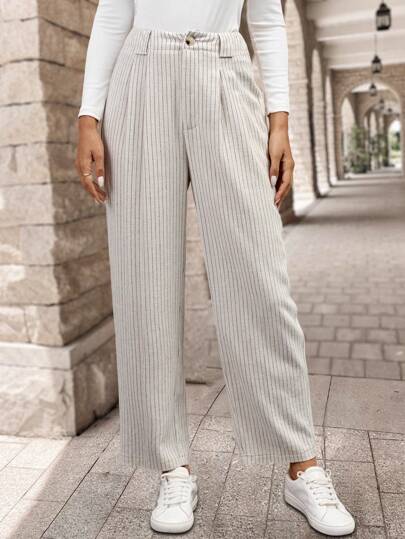 EMERY ROSE 女式前扣条纹休闲西装裤 - 卡其色 - 查看 1