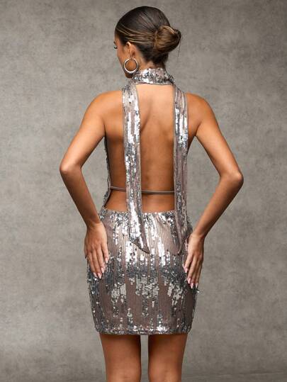 SHEIN BAE 女士卡其色和金色纯色图案迷人亮片露背紧身系带露背连衣裙,适合生日派对、夜间外出、主题派对、约会之夜、鸡尾酒会、圣诞派对、新年、感恩节 - 杏色 - 查看 6