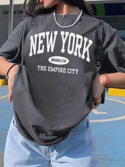 女士夏季字母印花露肩宽松休闲T恤,日常休闲百搭时尚。图案T恤,女士白色上衣,黑色上衣,粉色上衣,度假装扮 - 深灰色 - 查看 1