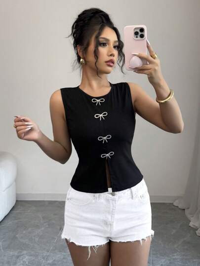 Elenzga 女士新款蝴蝶结装饰针织背心,休闲时尚春夏 - 黑色 - 查看 1