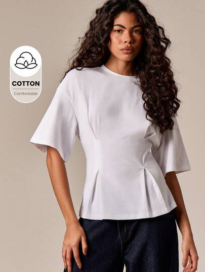 AiiRZ 女士荷叶边短袖T恤,收腰设计,宽松版型,适合日常休闲穿着 - 白色 - 查看 1