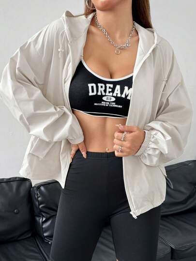 SHEIN EZwear 女式纯色拉链连帽抽绳夹克,带口袋,休闲日常穿着 - 杏色 - 查看 1