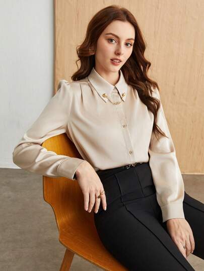 BizChic 女士秋季缎面领纽扣装饰长袖衬衫,基本款都市通勤简约优雅时尚商务休闲装,适合教师和办公室穿着 - 杏色 - 查看 7