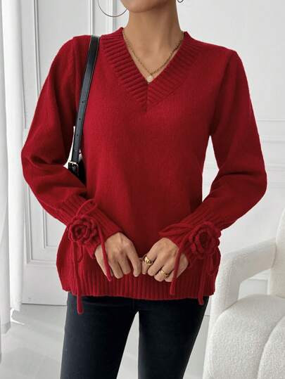Chiquease 女士红色 V 领贴花休闲百搭长袖套头毛衣、圣诞毛衣、女士冬装新年服装 - 紅色 - 查看 3