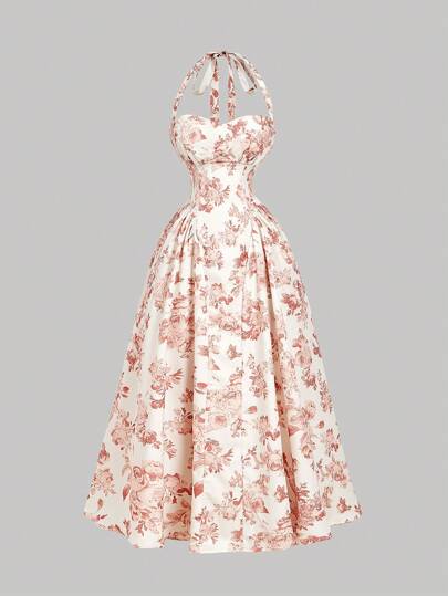 SHEIN MOD 女士浪漫花卉印花露背中长连衣裙 - 乾枯玫瑰色 - 查看 1