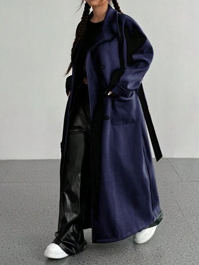 SHEIN Unity 女式纯色长袖长款休闲常规夹克,带口袋,秋冬 - 藏蓝色 - 查看 2