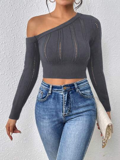 Chiquease 女士纯色不对称领长袖休闲日常针织套头衫秋冬毛衣 - 深灰色 - 查看 1