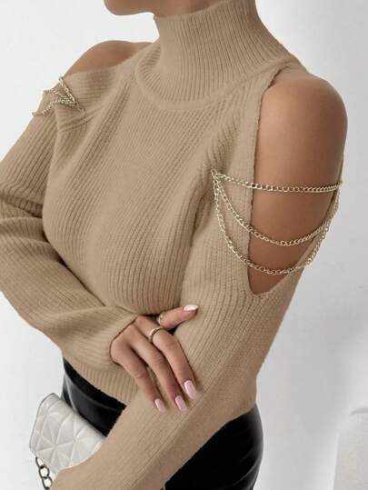Chiquease 女士纯色露肩长袖链条拼接优雅毛衣,适合秋冬季 - 卡其色 - 查看 1