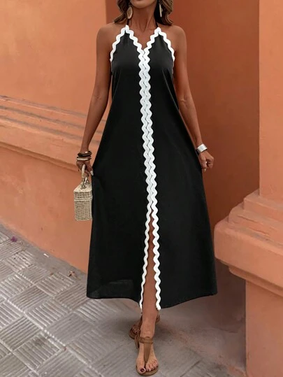 Breezaya 女士纯色拼接露背系带休闲长款连衣裙 - 黑色 - 查看 1