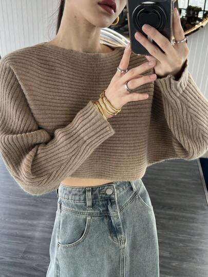 DAZY 女士纯色圆领蝙蝠袖长袖短款宽松毛衣,秋冬 - 卡其色 - 查看 1