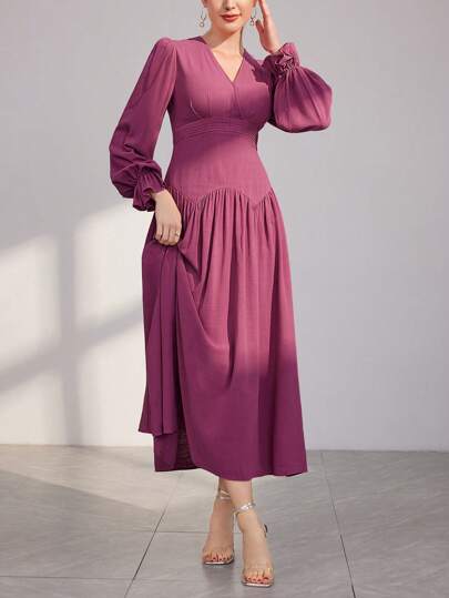 Modelyn 女士纯色荷叶边袖收腰连衣裙长款晚礼服 - 粉色 - 查看 1