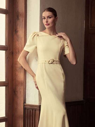 ZEYLAH 女式纯色短款泡泡袖优雅鱼尾下摆时尚连衣裙 - 黃色 - 查看 1