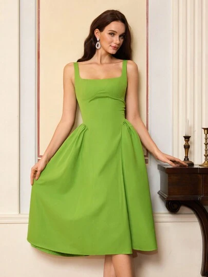 女式纯色方领无袖优雅腰部修身连衣裙 - 綠色 - 查看 1