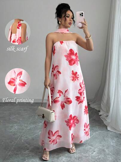 Elenzga 女士春夏度假旅行花朵印花露肩长裙(配腰带) - 彩色 - 查看 6
