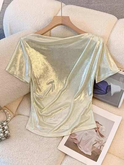 Chiquease 女性夏季優雅迷人的船領褶皺T卹 - 杏色 - 查看 1