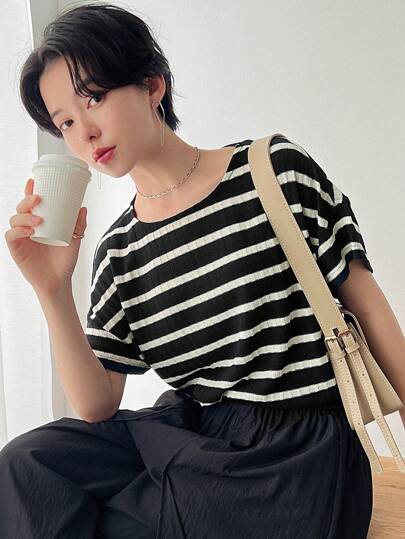 FRIFUL 女士夏季條紋印花圓領短袖休閒T恤 - 黑色 - 查看 1
