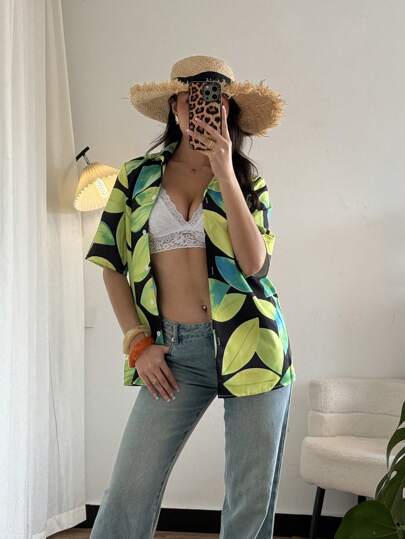 Breezaya 女士热带植物叶印花度假衬衫 - 綠色 - 查看 1