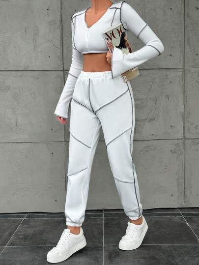 RueChic 女士 V 领长袖短款上衣和撞色边饰慢跑裤 2 件套 - 白色 - 查看 1
