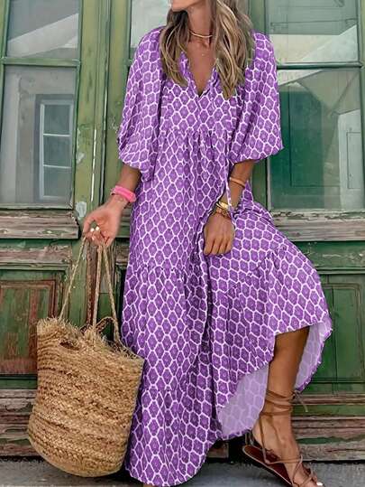 Breezaya 女士復古印花深V領夏季假日休閒連衣裙 - 紫色 - 查看 1