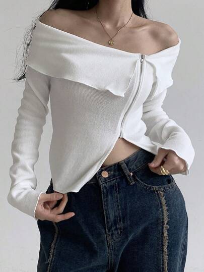 DAZY 女款正面拉鍊露肩開襟毛衣 - 白色 - 查看 1