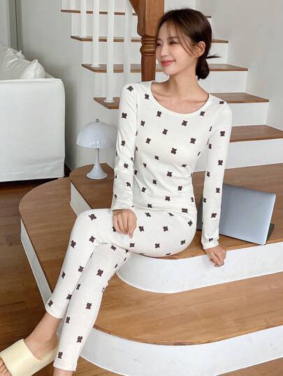 DAZY 女士全身印花修身圆领长袖睡衣套装 - 米色 - 查看 1