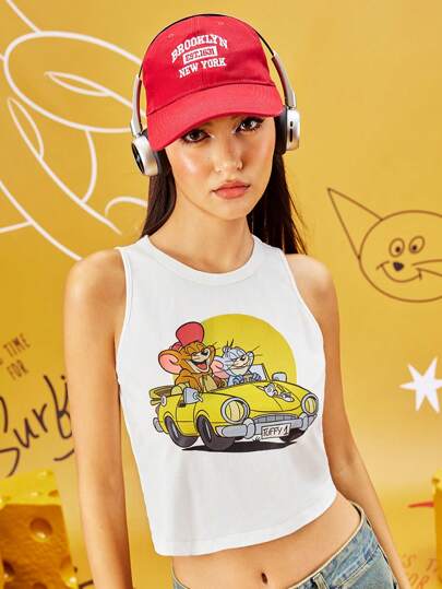 TOM & JERRY X SHEIN 女士休闲卡通印花短款背心,夏季 - 白色 - 查看 1