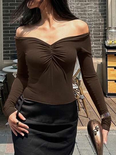 女式休闲纯色露肩褶皱修身长袖 T 恤,秋季 - 棕色 - 查看 1