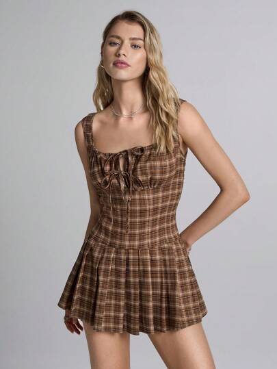 Easelle 女士咖啡色格子褶皱迷你连衣裙 - 彩色 - 查看 1