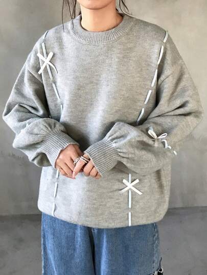 FRIFUL 女士圆领长袖蝴蝶结装饰休闲毛衣,秋季女装 - 灰色 - 查看 1