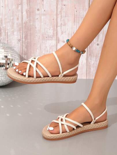 女式交叉繫帶露跟涼鞋,織物度假涼鞋 - 米色 - 查看 1