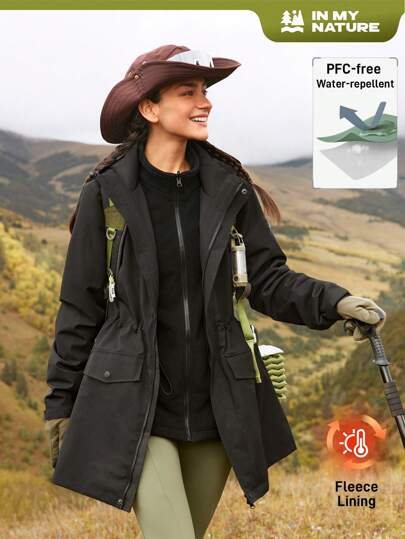 In My Nature 女士秋季纯色拉链口袋拉链连帽长袖户外风衣外套冬季女式上衣 - 黑色 - 查看 15