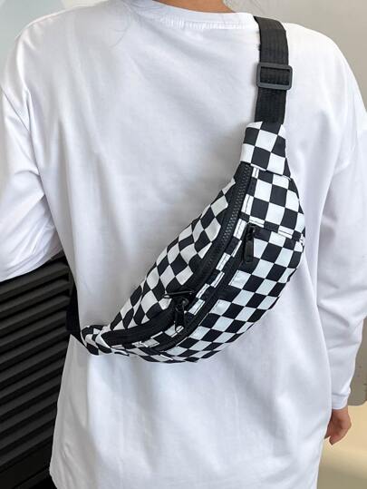 方格圖案腰包拉鍊適合日常生活 - 黑與白 - 查看 2